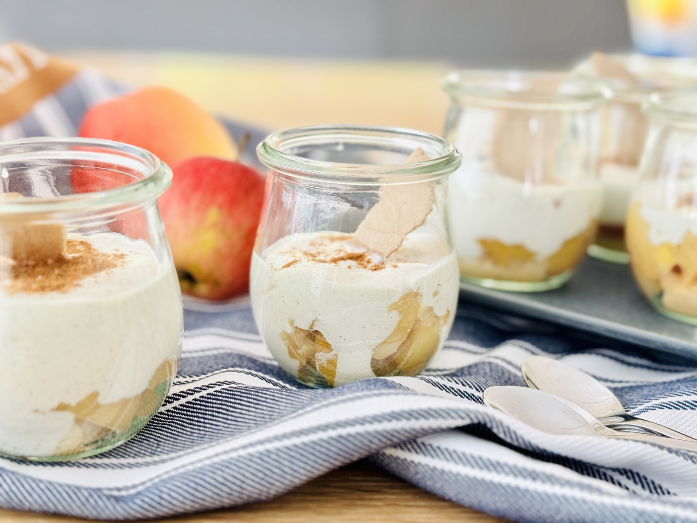 Richtig hübsch sieht das Dessert mit Äpfeln aus, wenn es in kleinen Gläsern serviert wird. Besonders gut dafür eignen sich die kleinen WECK-Gläser. Ein Kauf lohnt sich definitiv, denn sie können so vielseitig in der Küche zum Einsatz kommen. Falls diese Gläser nicht vorhanden sind, eignet sich auch eine Glasauflaufform.