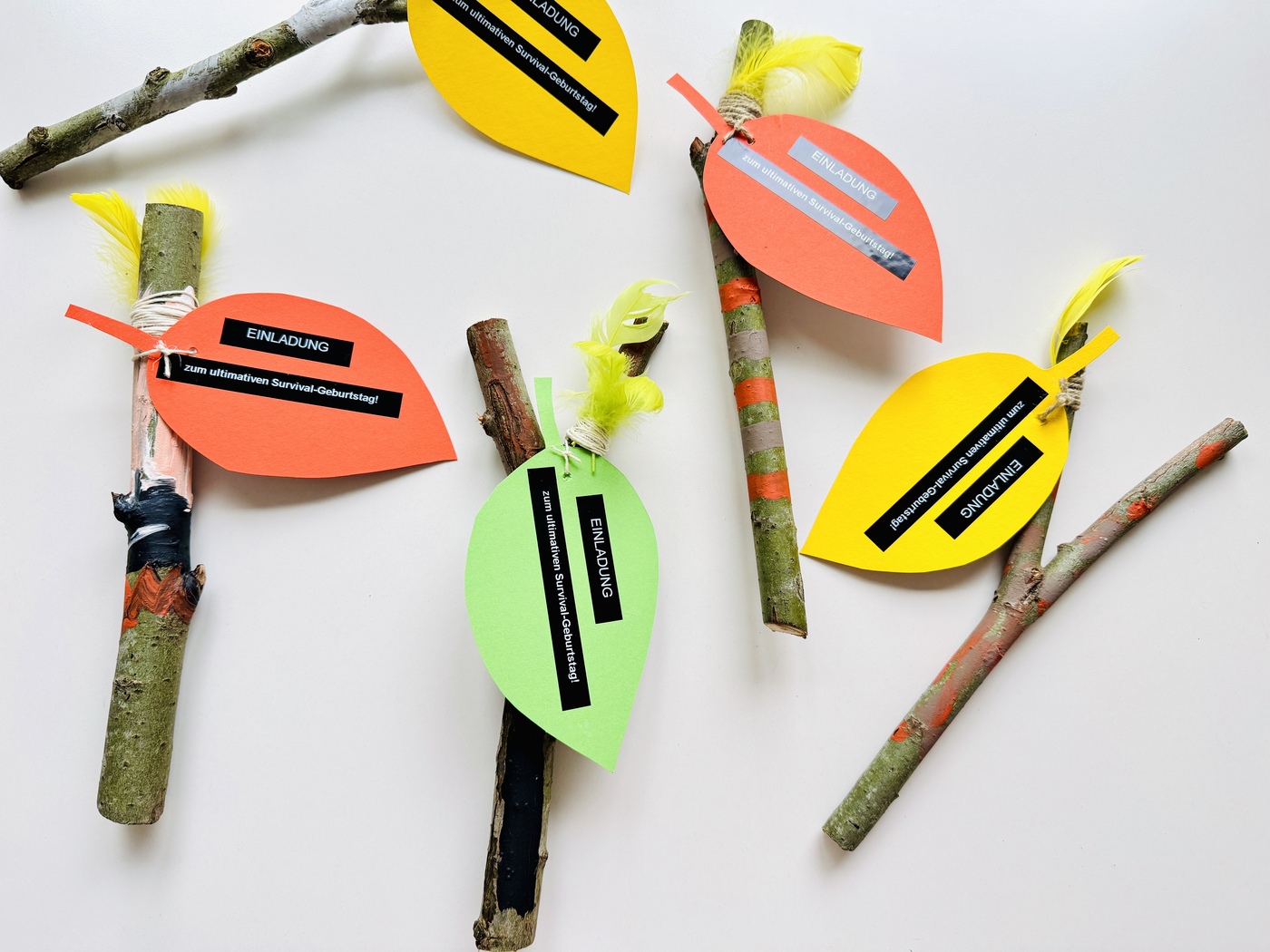 - Federn und Blatt befestigen: Mit etwas Schnur wird das Papierblatt (gelocht) zusammen mit ein paar bunten Federn am Ast befestigt. Das ergibt einen tollen natürlichen Look – perfekt für einen Outdoor-Geburtstag!