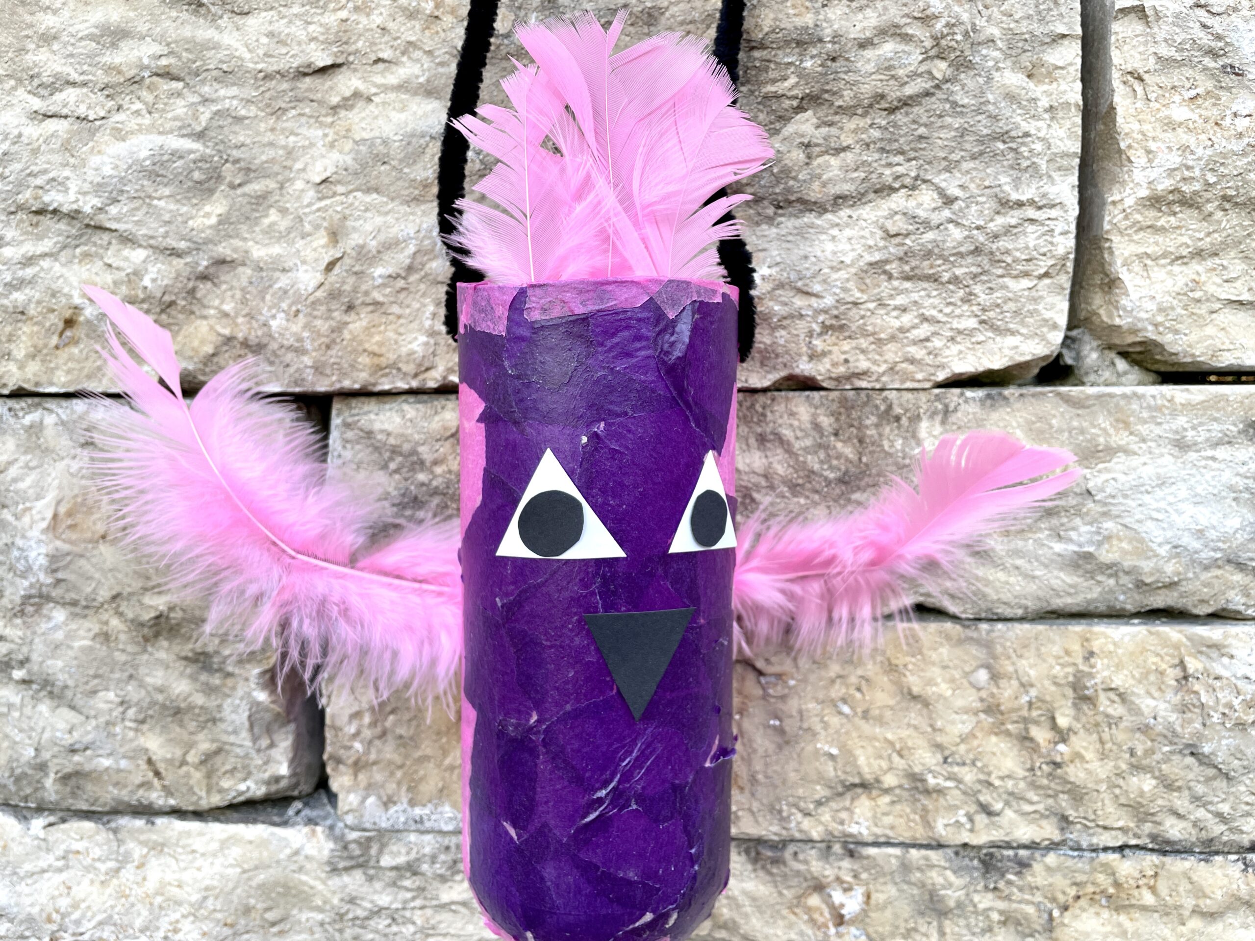 - Anschließend wird die Laterne verziert. Schnabel und Augen auf Karton vorzeichnen, ausschneiden und mit Heißkleber auf der Flasche anbringen. Federn ebenso ankleben.