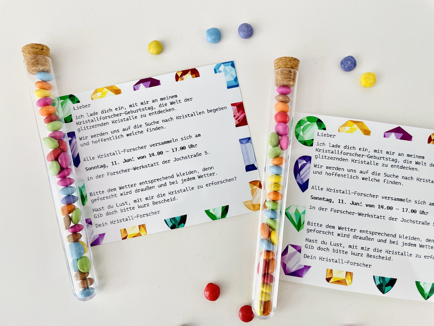 Ein Reagenzglas kann schnell mit dem Forschen in Verbindung gebracht werden. Genau deshalb beinhaltet die Einladung zum Kindergeburtstag auch ein Reagenzglas. Im Reagenzglas befinden sich Smarties. Anschließend wird das Reagenzglas mit einem doppelseitigen Klebeband an der Einladung befestigt. Fertig ist eine absolut kreative Einladung Forschergeburtstag.