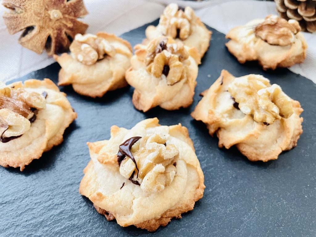 3. Teig in eine Spritzbeutel mit Lochtülle füllen und ca. 25 Kreise auf ein Blech mit Backpapier spritzen. Wer lieber kleinere Plätzchen hat, der kann auch etwas kleinere Kreise spritzen. Dann werden es natürlich mehr Plätzchen (und es werden auch mehr Walnusshälften benötigt).
