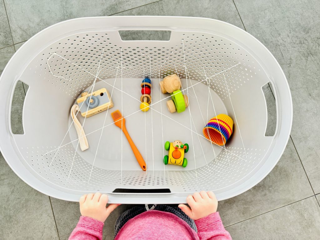 Die Bänder am Wäschekorb befestigen, sodass ein Spinnennetz entsteht. Anschließend das Spielzeug in den Wäschekorb geben. Fertig ist ein ganz schnelles DIY Spielzeug für Kleinkinder. Damit das Kind auch langfristig Freude am Spielen hat, lohnt es sich, immer wieder einmal Veränderungen vorzunehmen. Die Veränderungen können wie folgt aussehen: