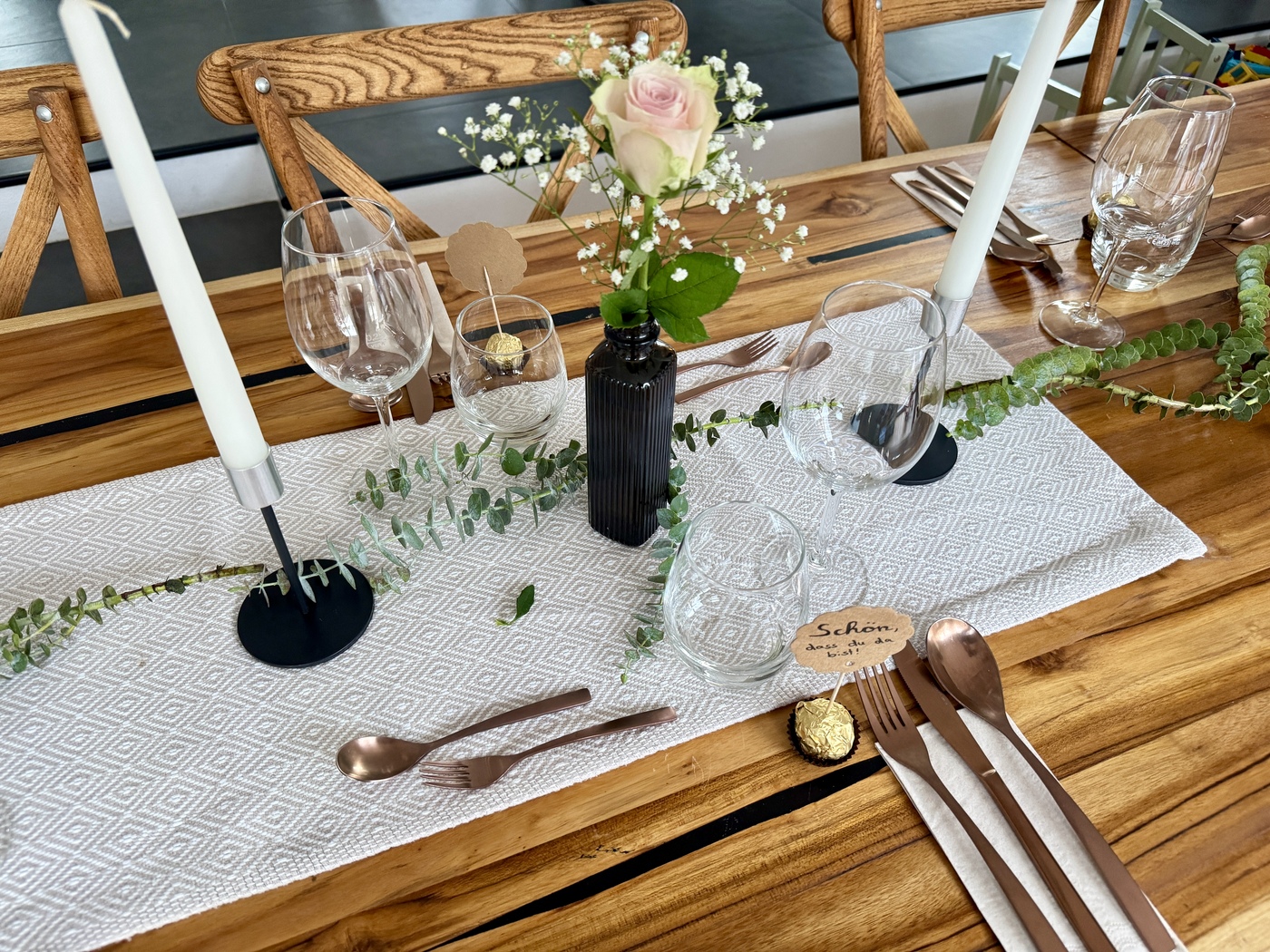 Lege einen neutralen Tischläufer in Weiß, Beige oder Grau aus. Diese Farben harmonieren wunderbar mit dem zarten Grün des Eukalyptus und schaffen eine ruhige Basis. Besonders passen ist es, wenn der Tischläufer auf einen hübschen Holztisch kommt. Falls der Tisch nicht hübsch ist, dann diesen mit einer Tischdecke komplett abdecken und darauf kommt dann der Tischläufer.
