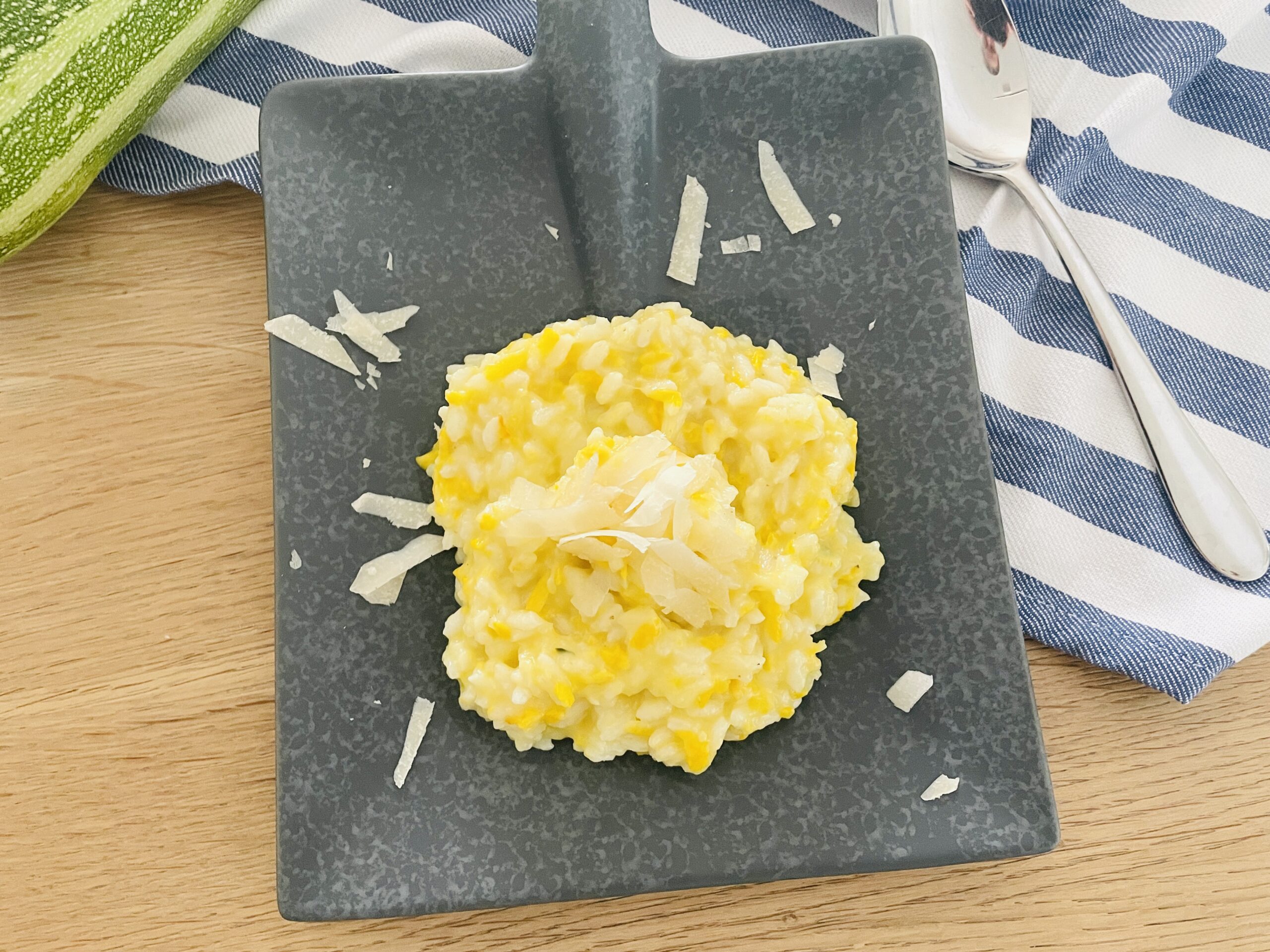 Nach Belieben kann das Zucchinirisotto auch mit etwas Parmesan bestreut werden. Das lässt das Risotto mit Zucchini besonders schmackhaft aussehen.